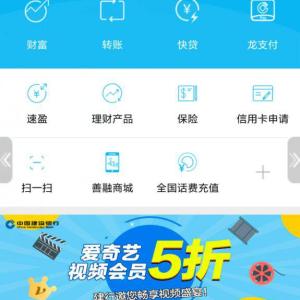建设银行用户点链接,下载建设银行客户端,安装后,在中部横幅找到《爱奇艺视频会员5折》,点精选,可5折购买爱奇艺黄金会员年卡,点 视频盛宴,可55折购买优酷黄金会员年卡。