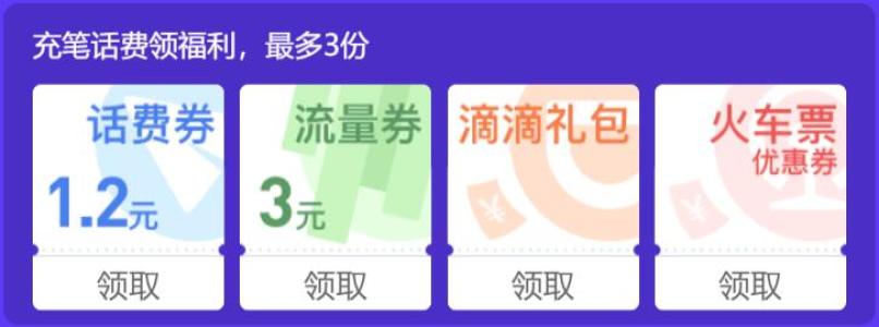 手机点链接,登录QQ,每充值一笔话费,可以从1.2元话费券,3元流量券,7-15元滴滴打车快车券,9-15元火车票优惠券中,选择一份福利领取,并抽奖一次。每人最多充值3笔,可领取3份福利、抽奖3次。