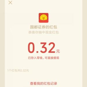 进入微信,点右上角+,添加朋友,公众号,搜索 国都证券,点右下角,精彩活动,股市答题王,参与排位赛,每个人每局需要20金币,只要赢一局即可抽红包,如果金币不够,可以3个小时,在进入活动,领取30金币。小希抽到了0.32元,到账微信零用钱,可提现。