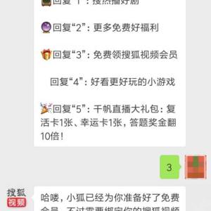 进入微信,点右上角+,添加朋友,公众号,搜索 搜狐视频客户端,关注后,回复3,点 请先登录你的搜狐视频帐号,输入手机号和密码,登录后,即可获得3天搜狐视频会员VIP,除了客户端,电脑端和移动端也可用。可以观看会员专享影片,跳过广告,蓝光画质等特权。