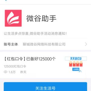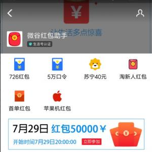 进入支付宝,搜索 微谷,点 微谷红包助手,点《7月29日 红包50000》,进入后,关注 微谷助手 生活号,稍等片刻,跳转到红包口令页面,会自动获得现金红包。小希获得了0.52元,到账支付宝余额,可提现。