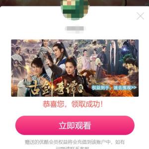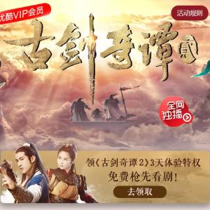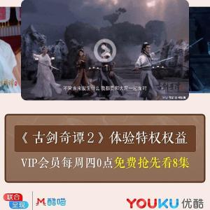 点链接,登录优酷。点领《古剑奇谭2》3天体验特权,可享受为期3天的《古剑奇谭2》抢先看特权,《古剑奇谭2》免广告特权,VIP会员每周四0点免费抢先看8集。本权益适用于PC/手机,不可用于tv端及ipad端,且不与其他优惠活动同享。