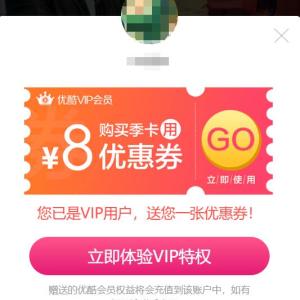点链接,下拉到中部,点领取,登录优酷,可领取《周六夜现场》3天VIP体验特权,观看《周六夜现场》XXXL版,比免费版增加了笑料和看点。享受《周六夜现场》无广告和1080P画质。小希之前免费领了1个月的优酷会员,所以得到的8元优惠券,购买优酷季卡可用。