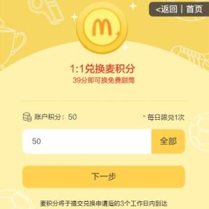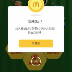 点链接,登录QQ,参与麦当劳和腾讯体育举办的《脑洞竞猜,麦礼狂欢》活动,签到得50积分,点左上角头像,将积分1:1兑换成麦积分,需要输入你注册麦当劳的手机号,3个工作日积分到账。微信关注麦当劳,……