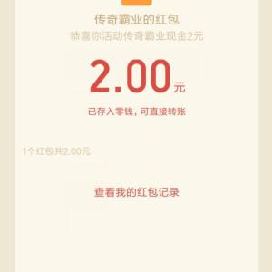 传奇霸业领2元现金红包