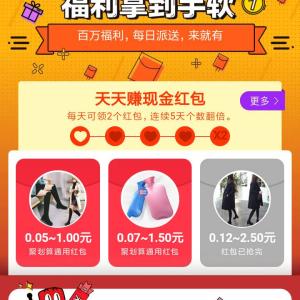 下载安装淘宝APP,每天点 聚划算,我的,点 福利社,根据红包金额范围,选择 任意 2个商品,点开,设置 开团提醒,可领取 0.05-2.5元不等的红包。每天领2次,连续5天可领次数翻倍。红包可在 聚会算 购物时 抵扣现金。自领取之日起30天内有效。