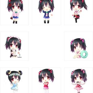 校服、制服、女仆装,泳衣,常服,演出服,穿着各种服饰,眨眼睛、吐舌头、作剪刀手和ILOVEYOU手势卖萌的Q版全身的LoveLive!矢泽妮可头像,画师Gyaza伽莎作品。