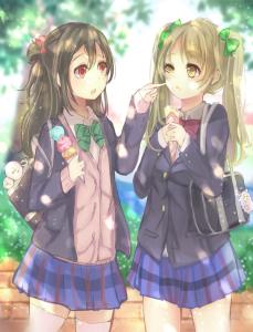 看你的冰淇淋蹭到脸上啦。画师くらし笔下交换萌点后,长直发的矢泽妮可,双马尾的南小鸟萌萌哒的绘图!