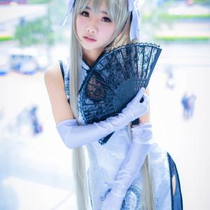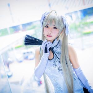 双长马尾萌呆毛,持扇清萌摆拍,Chanlyco鬼畜瑶穿着印花龙纹旗袍,在YACA春季漫展激萌还原《缘之空》穹妹形象。