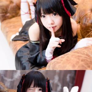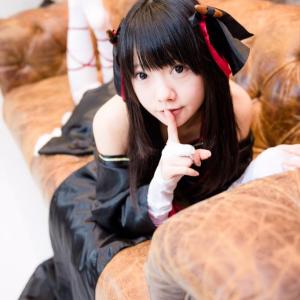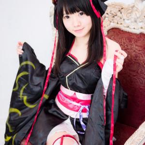 作嘘手势,眨眼卖萌,あっきん穿着黑色振袖和服,激萌还原《机巧少女不会受伤》女主角夜夜形象。