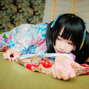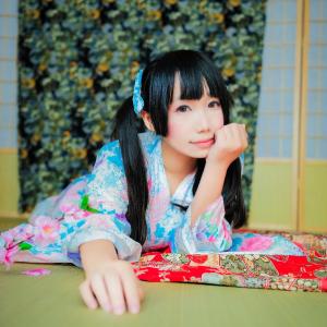 披着双长马尾,作心形手势卖萌,梓喵演唱会感动场景再现,小凪まゆ还原《轻音少女》第一部中野梓蓝色和服形象。
