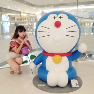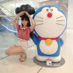 精彩颜艺,小圆脸雪雪逛商场时,和哆啦A梦在一起的卖萌照。