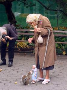 来自俄罗斯摄影师在路边偶遇的场景抓拍,一位老奶奶正操作提线人偶给松鼠喂食的温暖瞬间。