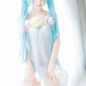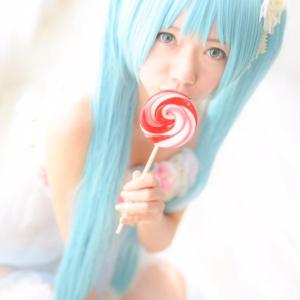 双长马尾初音和大大的棒棒糖,天然萌あっきん穿着淡蓝色睡衣,扮演初音未来Cosplay。