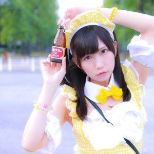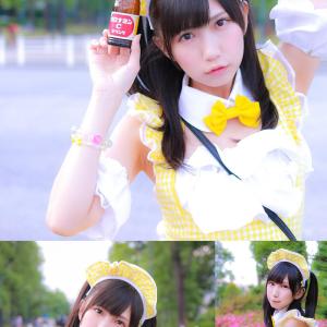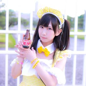 作猫爪扮小猫、抿嘴卖萌,拥有ORONAMIN维生素C饮料的元气满满萌女仆,小日向くるみ穿着黄色女仆装秋叶原摆拍,摄影师しゅーたん作品。