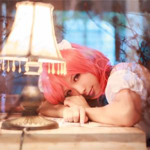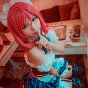 萌萌哒的粉色公主卷发,icey扮演LoveLive!西木野真姬,附西木野真姬蓝色短裙女仆装卡牌原图。