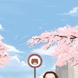 樱花飞舞的四月来了,抱着包,一起在站牌下等车,鹿卡斯和牛轰轰四月樱花手机壁纸,画师刘珍珍作品。