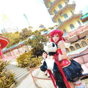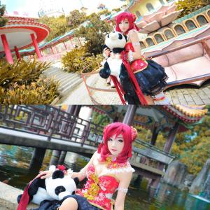 抱着熊猫玩偶萌系摆拍,miyuko穿着中国风旗袍,还原《Love Live!学园偶像祭》μ's成员西木野真姬SR卡牌形象。