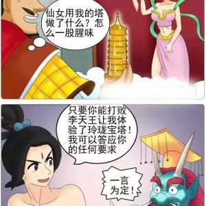 龙王找到了李天王,要李天王子债父偿,打败了李天王。李天王受伤,只好将玲珑宝塔交给仙女保管。仙女帮忙照顾了李天王,分离时,才回想起了与龙王的约定,原来仙女早就对玲珑宝塔有所图谋。