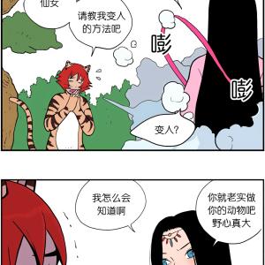 动物羡慕人的生活,于是老虎和熊都向仙女祈祷,请教变成人的方法。仙女说不知道,让老虎和熊安心做动物。马也向仙女请教方法,仙女突然想起了一种方法,就是在洞穴里吃葱和大蒜,方法还没说完,马的女朋友出来表示也要变成人类,于是仙女让他们两人在洞穴里呆99天。