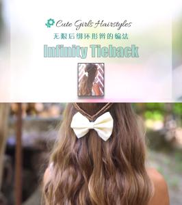 盘在头后上部的蕾丝辫,戴在瀑布上的蝴蝶结。适合宴会、典礼及日常造型。可爱女生发型系列视频教程之向上蕾丝辫发型的编法。