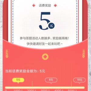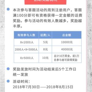 点链接,参加新闻晨报《生逢其时》活动,点开始测试,回答问题,全部答对后,点查看奖励,输入手机号,获得话费奖励资格,奖励随参与人数增加。有效参与人数小于2000人,每人5元话费,超过2000小于5000人……