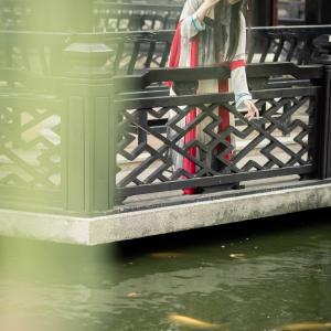 玲珑水榭,长廊院宇,小雨初歇,安姐姐穿着齐胸襦裙汉服,余荫古韵清萌摆拍,摄影师小宏红MKIII作品。