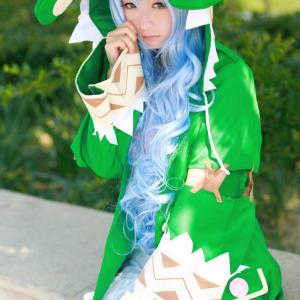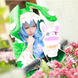 穿着兔耳绿色斗篷,拿着布偶萌系少女,树里《约会大作战》四糸乃Cosplay。