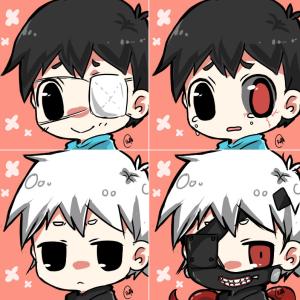 从黑色头发的服务生到白色头发的喰种,Q版萌系画风,动画《东京食尸鬼》中的男主角金木研四种状态头像,画师Ritsuneko作品。