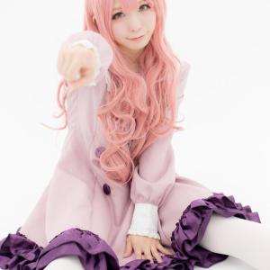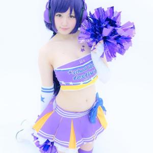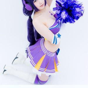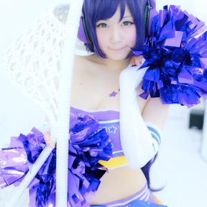 清萌拉拉队员,御伽ねこむ穿着紫色拉拉队服,还原《LoveLive!》觉醒后SR卡牌眨眼卖萌的东条希形象,摄影师ロウガ、ま~さん作品,附人设图。