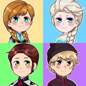 安娜、艾莎、汉斯和克里斯托夫,迪士尼动画童话中公主、王子和采冰人的《冰雪奇缘》Q版可爱头像,画师the-wicked-king-spoke作品。