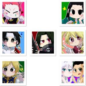 西索、伊路米·揍敌客、奇犽·揍敌客、飞坦、比司吉·酷露佳、酷拉皮卡、牙杰同人CP,Q版萌系画风,腐女向全职猎人头像。画师komA作品。