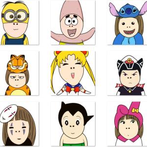 女孩小明明,扮演小黄人、派大星、史迪奇、加菲猫、月野兔、黑猫警长、无脸男、阿童木和美乐蒂等卡通形象的头像,画师漫画家小明作品。