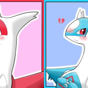粉色和蓝色甜蜜搭配,《口袋妖怪》的精灵,动画《水都的守护神》的主角拉帝欧斯和拉帝亚斯情侣头像,画师2027作品。