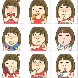 西瓜、鸡腿、汉堡包、冰淇淋、面包、串串香、饺子和面条等,吃到心满意足!小明明大胃王吃货女孩头像。画师漫画家小明作品。