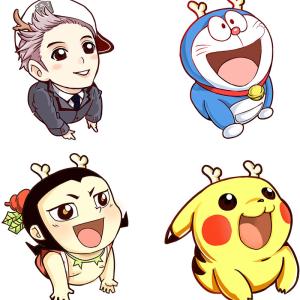女孩小明明扮演大白、HelloKitty、超级马里奥、海绵宝宝、哆啦A梦、龙猫、樱桃小丸子、皮卡丘等九位动漫角色头像,画师漫画家小明作品。