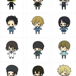 无头骑士异闻录主要角色塞尔提·史特路尔森、折原临也、平和岛静雄、龙之峰帝人、纪田正臣、园原杏里、岸谷新罗,Dollars成员门田京平、游马崎沃克、狩泽绘理华,艺人平和岛幽等全身头像,大头Q版风格,画师成田良悟作品。