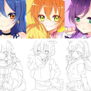 LoveLive!园田海未、星空凛、东条希真实动画比例头像及相应线稿,画师りあ作品。