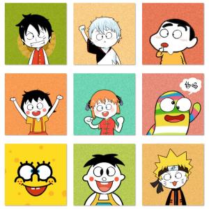 路飞、坂田银时、小新、樱桃小丸子、神乐、砳砳、海绵宝宝、旺仔、漩涡鸣人等动漫卡通斗鸡眼神情头像一组,画师喃东尼作品。