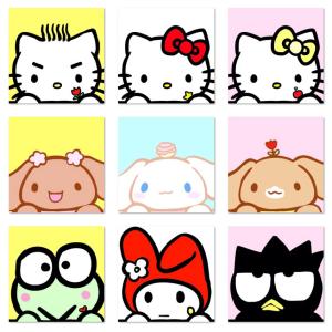 由丸子小生创作的HelloKitty、Cinnamoroll(玉桂狗、肉桂狗)、KEROKERO KEROPPI(大眼蛙可洛比)、my melody(美乐蒂)和BadBadtz-maru(酷企鹅)扒窗口头像一组。