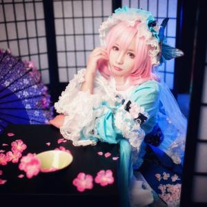 蝴蝶结元素添萌点,小番茄扮演《东方Project》中有“幽冥楼阁的亡灵少女”之称的西行寺幽幽子。