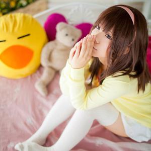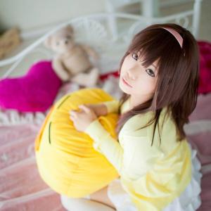 粉红色的发箍,收起的刘海儿,小熊和小鸡玩偶可知道我的心意,Yun Kousaka扮演《伪物语》千石抚子。