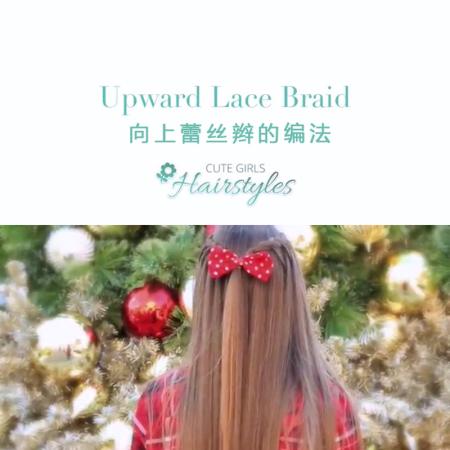 盘在头后上部的蕾丝辫,戴在瀑布上的蝴蝶结。适合宴会、典礼及日常造型。可爱女生发型系列视频教程之向上蕾丝辫发型的编法。