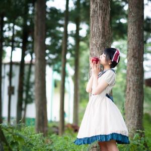捧着红苹果,宛如白雪公主,Panzerella穿着高腰连衣裙,林间清萌摆拍。