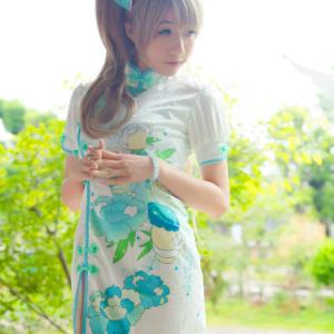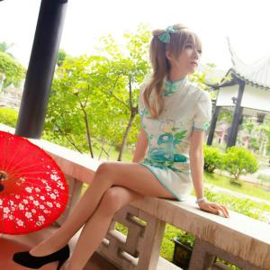 叶有清风花有露,青凉伞上微微雨,Panta穿着旗袍,持伞还原LoveLive!软软萌妹南小鸟形象。