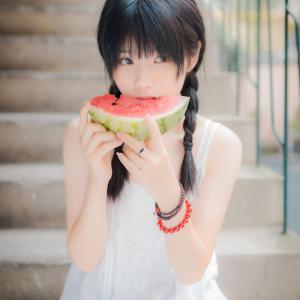 双马尾辫,吃西瓜,这个夏天有点甜。佐流穿着白色连衣裙夏季拍照一组。