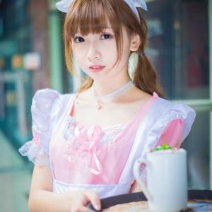 “主人,欢迎回来,要到店里坐坐么?”萌语配萌图,小圆脸雪雪粉色女仆装在咖啡馆剧情小长条。