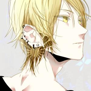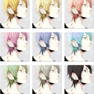 橙、黄、粉、紫、蓝、青、绿、灰、黑色头发及眼睛,戴着耳钉的长发白皙男孩头像,画师爽作品。