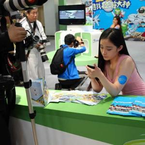 2013年网博会,巨人网络展区的两位身穿白色旗袍的妹子面对镜头,开心地卖萌。