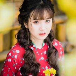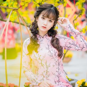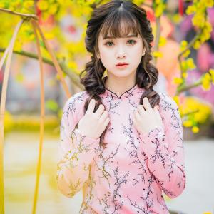 农历新春祈福,来越南花市看黄灿灿的腊梅花,棕色双马尾卷发,齐刘海儿粉色旗袍少女,摄影师 TRUONG QUAN 拍摄于越南山茶半岛的人像作品。